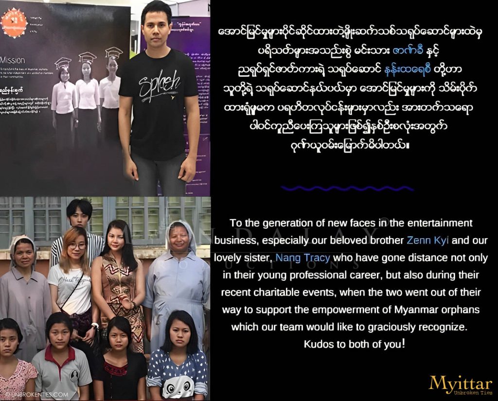 We commend our esteemed brother, "Zankyi," and beloved sister, "Nang Tracy," for their impressive career strides and philanthropic support. Their dedication to empowering Myanmar orphans through our charity movie, "Myittar," showcases a profound commitment to making a positive impact.