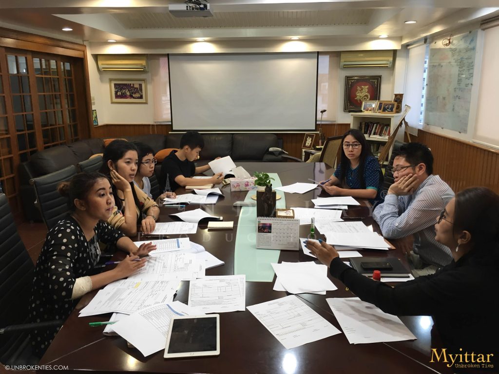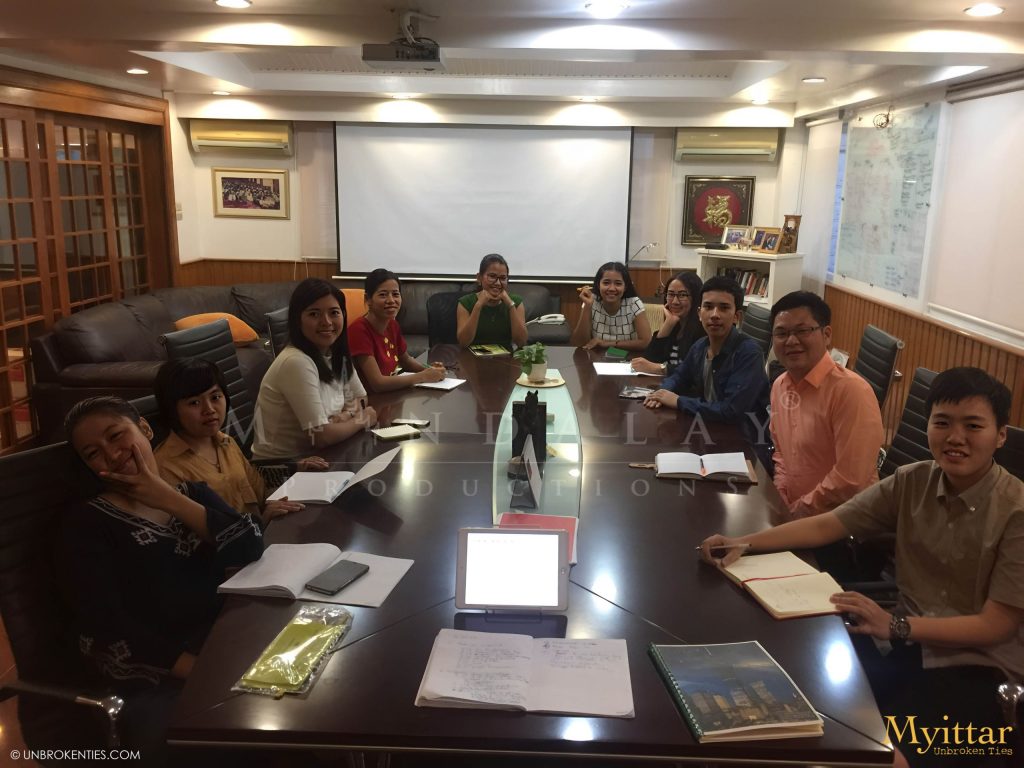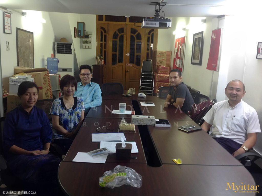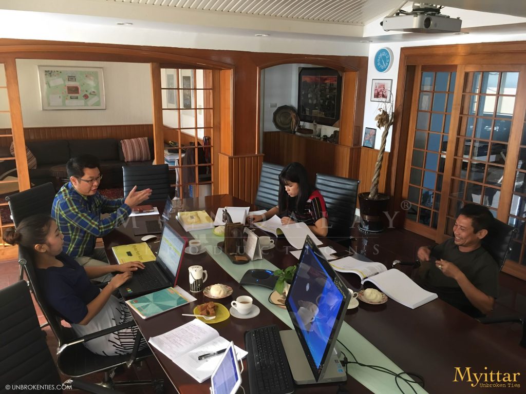 YANGON, MYANMAR - Original Myittar Story Discussion - the very first Director Kyi Phyu Shin (ကြည်ဖြူရှင်) at her office Downtown Yangon (L to R); Director Kyi Phyu Shin, Mary K. Yap (Author and Writer), Phillip Wong, Ye Thi Ha (ရဲသီဟ), Ah Way.