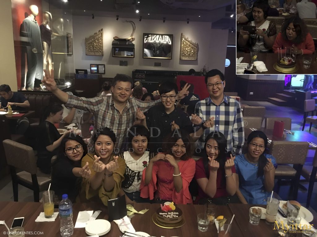 YANGON, MYANMAR - The MP staff joyfully celebrates a fun birthday bash for Meme Lwin (Nationwide Movie Survey Project Lead) at the popular local hangout eatery: Hard Rock Cafe Yangon, sharing laughter, cake, and memorable moments together.