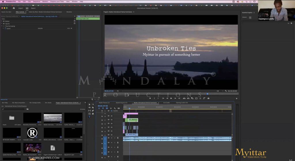 SAN FRANCISCO, CA - Landry Gapangwa, the dedicated First Editor for the Myittar Charity Film, is meticulously honing the final touches of our cinematic masterpiece. Among the myriad tasks, one stands out—an intricate refinement: the transformation of our international title to the resonant and evocative "Unbroken Ties."