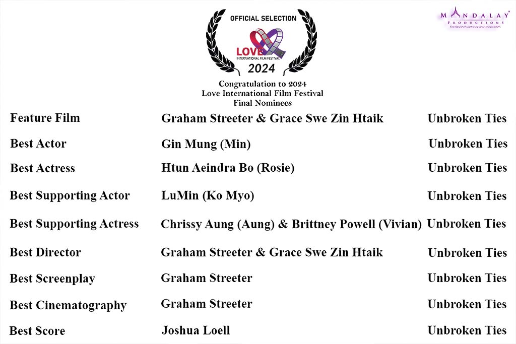ENCINO, CALIFORNIA – Myittar (English Title: Unbroken Ties) received nine nominations at the 10th Love International Film Festival, including Feature Film, Best Actor, Best Actress, Best Supporting Actor, Best Supporting Actress, Best Screenplay, Best Cinematography, and Best Score. We sincerely thank the Love International Film Festival for this incredible recognition.